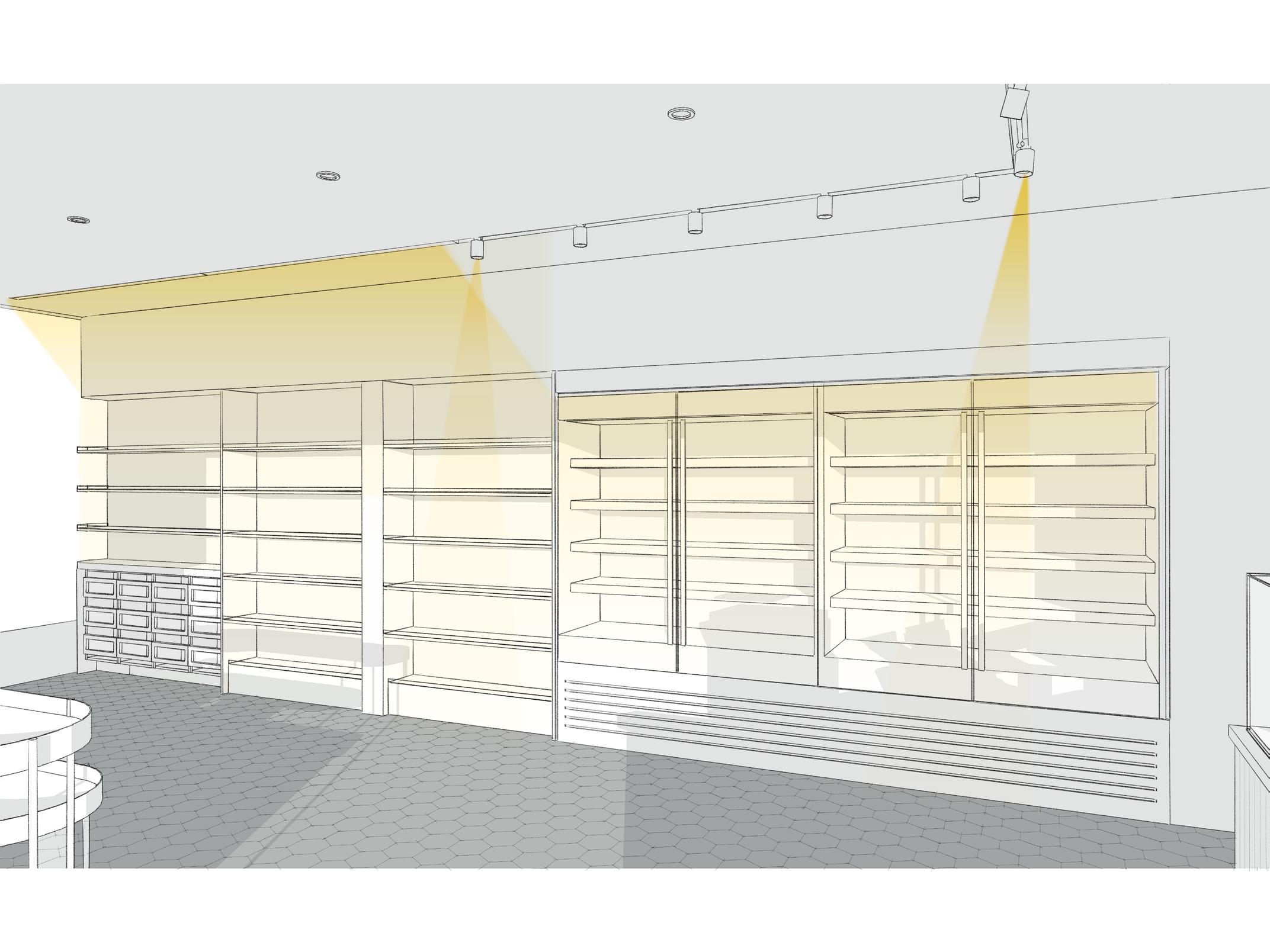 The use of minimalistic architectural lighting keeps the focus on the product display. Lighting design should be used to illuminate key zones and products.