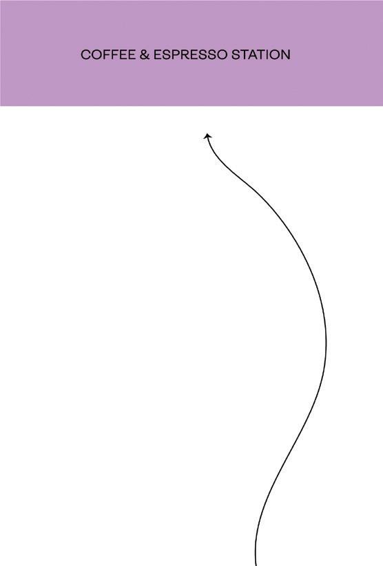 The Coffee & Espresso station is the focal point, conveying a premium beverage experience. Locate the dry goods display along the queuing area to maximize guest browsing. Create an intuitive guest flow for the coffee program by co-locating cup and ice dispensers adjacent to the coffee equipment, condiments, and refuse.