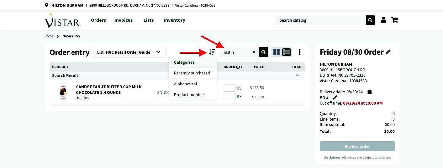 Check approved Products list and enter in code to identify your hotel’s local Vistar contact first!