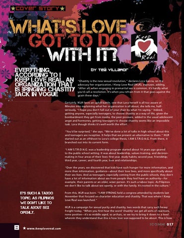 by Teá Villamor “Chastity is the new sexual revolution,” declares Lora Garcia, on the advocacy her organization, I Keep Love Real (IKLR), espouses, adding, “After all, when engaging in premarital sex is common, it’s hardly what you’d call a revolution. It’s when you refrain from it that goes against the grain these days.” Certainly, IKLR faces an uphill battle, one that Lora herself is all too aware of. Minutes into explaining what her organization is all about, she tells me, halfseriously, “I hope you don’t fall out of your chair by what I’m saying.” Indeed, getting anyone, especially teenagers, to choose chastity as a way of life, given the bombardment they get from media, the peer pressure, added to the usual adolescent angst and hormones, getting teenagers to choose chastity seems like an impossible task. Lora though thinks it’s well worth the effort. “You’d be surprised,” she says. “We’ve done a lot of talks in high school about this and teenagers are receptive. It helps that we present an alternative to them.” IKLR started out as an offshoot to Lora’s college thesis, I AM S.T.R.O.N.G. From there, it branched out into its current form. “I AM S.T.R.O.N.G. was a leadership program started about 10 years ago geared to the public school setting. It was about leadership, values training, and decisionmaking in four areas of their lives: first year, study habits; second year, friendship; third year, career; and fourth year, love and relationships. “Over the years, we discovered that kids have such hunger for more information, and more than information, guidance—about their love lives, and more specifically about their sex lives. And as teenagers, especially coming from the public schools, they don’t have a lot of information about sex from people they feel have an authority—for example, their parents or an older, wiser person. It’s such a taboo topic. As Filipinos we don’t like to talk about sex openly, or with the family. It’s rooted in the culture.”
