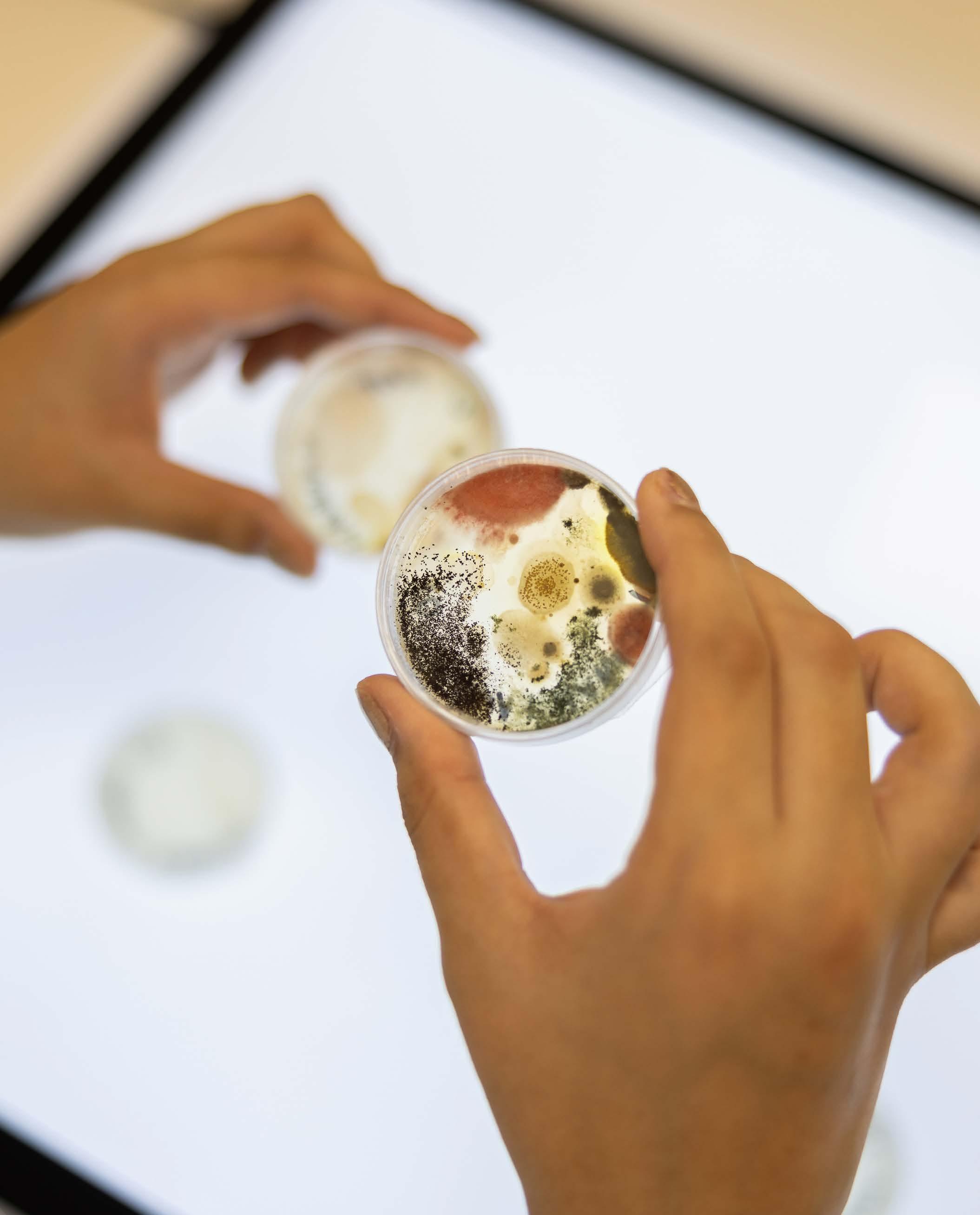 In Material Ecologies werk je hands-on, in de werkplaatsen met materialen zoals hout, klei, of bijvoorbeeld textiel. En in het biolab -Material Incubator, met micro-organismen. Tegelijkertijd stellen we vragen: wat beschouwen we eigenlijk als materiaal? Zijn organismes zoals zeewieren een materiaal? Kunnen digitale data—de bits en bytes—ook een materieel narratief dragen? Door te observeren en onderzoek en het werken met je handen ontwikkel je praktische vaardigheden en vertaal je inzichten naar krachtige visuele verhalen.