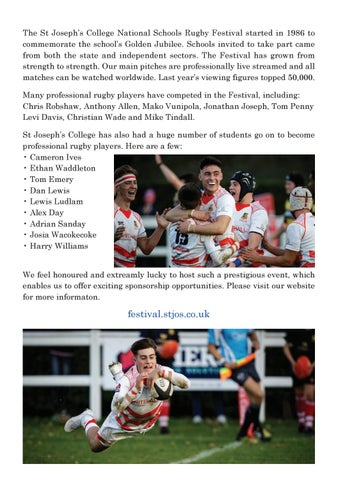 The St Joseph’s College National Schools Rugby Festival started in 1986 to commemorate the school’s Golden Jubilee. Schools invited to take part came from both the state and independent sectors. The Festival has grown from strength to strength. Our main pitches are professionally live streamed and all matches can be watched worldwide. Last year’s viewing figures topped 50,000. Many professional rugby players have competed in the Festival, including: Chris Robshaw, Anthony Allen, Mako Vunipola, Jonathan Joseph, Tom Penny Levi Davis, Christian Wade and Mike Tindall. St Joseph’s College has also had a huge number of students go on to become professional rugby players. Here are a few: • Cameron Ives • Ethan Waddleton • Tom Emery • Dan Lewis • Lewis Ludlam • Alex Day • Adrian Sanday • Josia Wacokecoke • Harry Williams We feel honoured and extreamly lucky to host such a prestigious event, which enables us to offer exciting sponsorship opportunities. Please visit our website for more informaton.