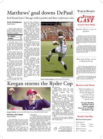 Red Storm leave Chicago with 3 points and first conference win KYLE FITZGERALD Staff Writer The St. John’s men’s soccer team followed up their win against Columbia last Wednesday with a 2-0 shutout victory at DePaul on Saturday. ST. JOHN’S