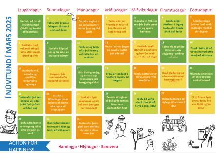 jákvæðum tillögum fyrir hvern dag mánaðarins Tillögurnar eru í anda þess sem rannsóknir hafa sýnt að geti hjálpað fólki að lifa hamingjuríkara lífi sem að gefa að sér, tengjast öðrum, finna tilgang, leiks sér og njóta augnabliksins. Flestar þeirra eru bráðskemmtilegar og auðveldar í framkvæmd.
