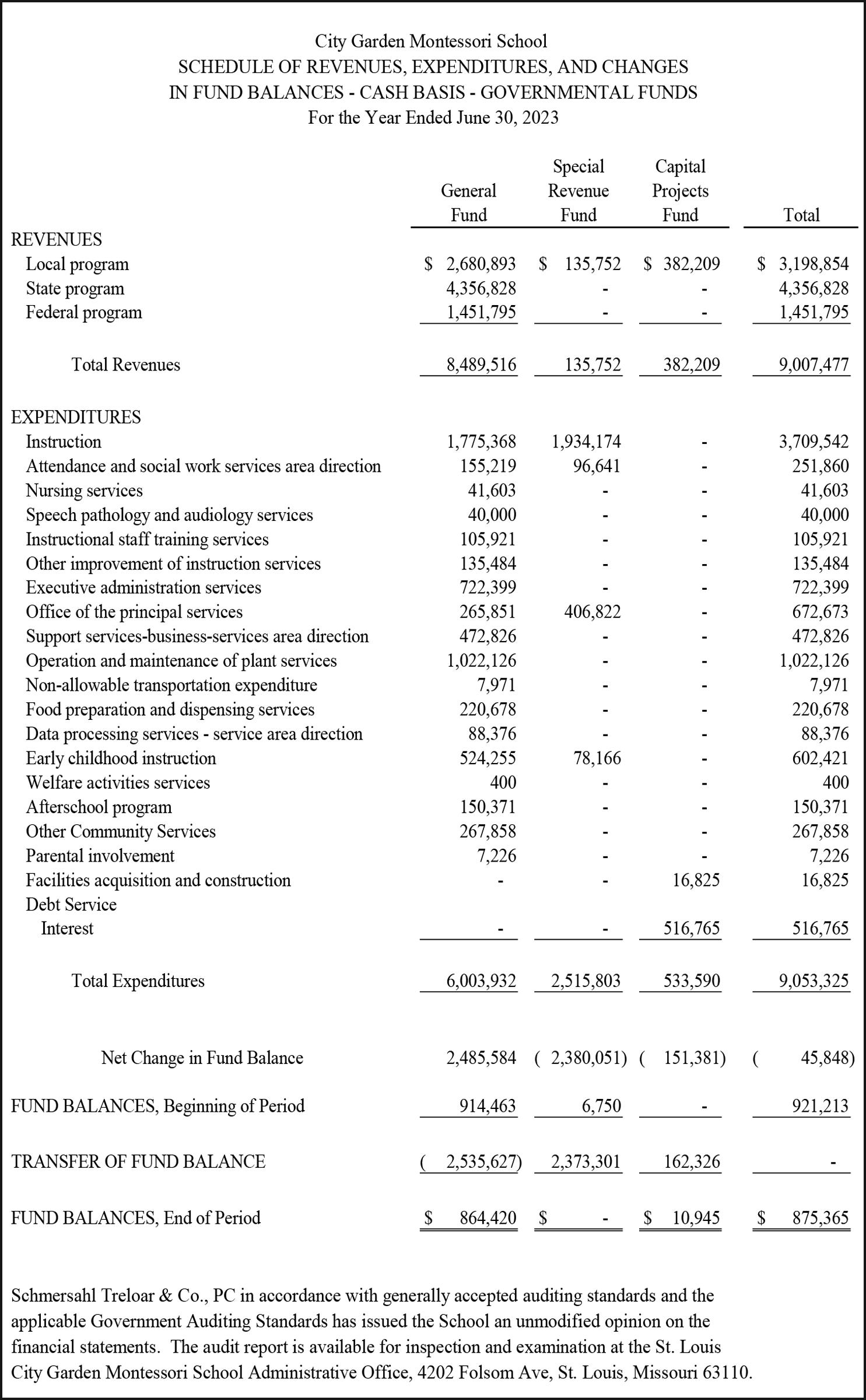 The report shows balances for the general, teachers’ and capital projects funds totaled $17,250,005, $0, and $287,485 for a total governmental funds balance of $17,537,490 at fiscal year ended 2023.