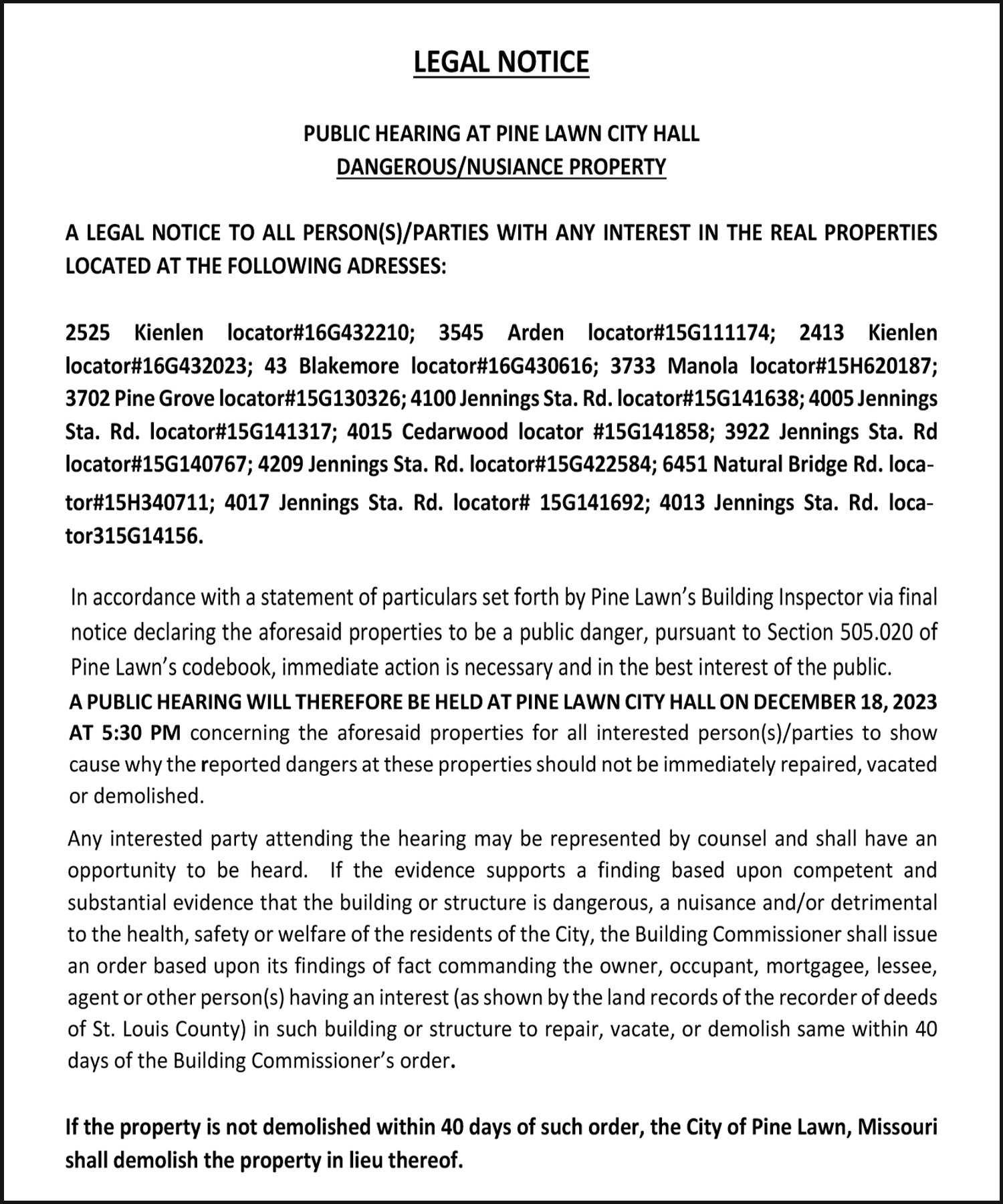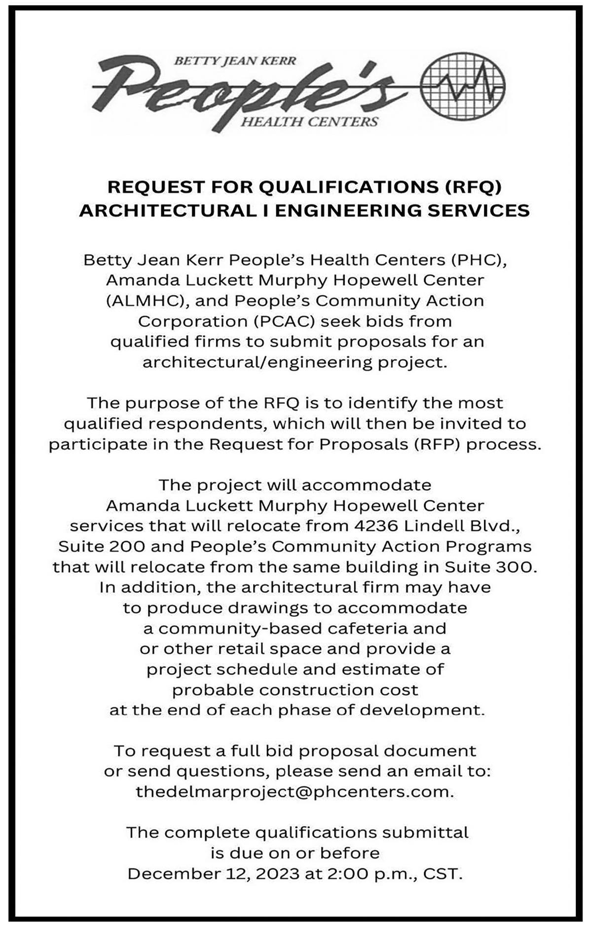 REQUEST FOR QUALIFICATIONS for PROFESSIONAL ENGINEERING SERVICES FOR LOUISIANA CALM STREETS, PHASE II, ST. LOUIS, MISSOURI, FEDERAL PROJECT NO. TAP-9901(695). Statements of Qualifications due by 5:00 PM CT, December 20, 2023 through the Bid Express online portal at https://www.bidexpress.com/ businesses/20618/home?agency=true. RFQ may be obtained from BPS website https://www. stlouis-mo.gov/government/ departments/public-service/, under BPS RFQ and RFP Announcement, or email Board of Public Service at bryanth@ stlouis-mo.gov 14% DBE participation goal.