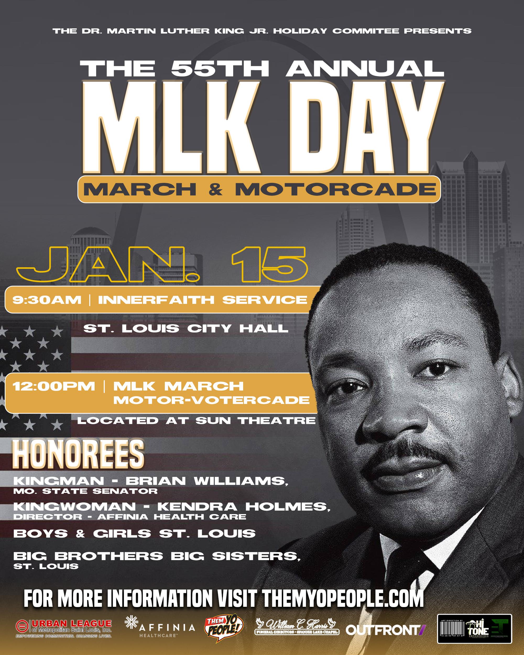 American Federation for Government Employees, Jewish Community Relations Council of St. Louis, among others. The MLK Faithful Service Award will be given out to honorees who have distinguished themselves in the area of Social Justice.