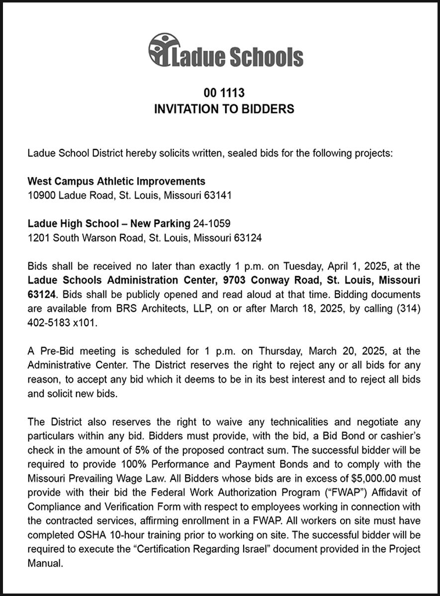 Plans and specifications will be available on March 3, 2025 from the St. Louis County Web Site (www. stlouiscountymo.gov) or by contacting Cross Rhodes Print & Technologies, 2731 South Jefferson Avenue, St. Louis, MO 63118 (314) 678-0087.