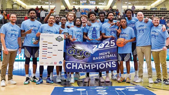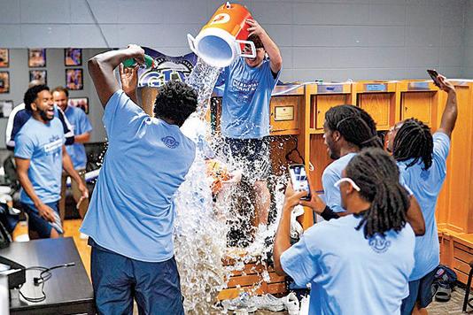 Lincoln University players douse head coach Jimmy Drew with water in the locker room following their Great Lakes Valley Conference Tournament championship game victory over the University of Missouri-St. Louis at Hyland Arena in St. Charles. The Blue Tigers won an automatic berth to the NCAA Division II men’s basketball tournament where they will take on host Lake Superior State at 2:30 p.m. Saturday, March 15. For more coverage, see Sports.