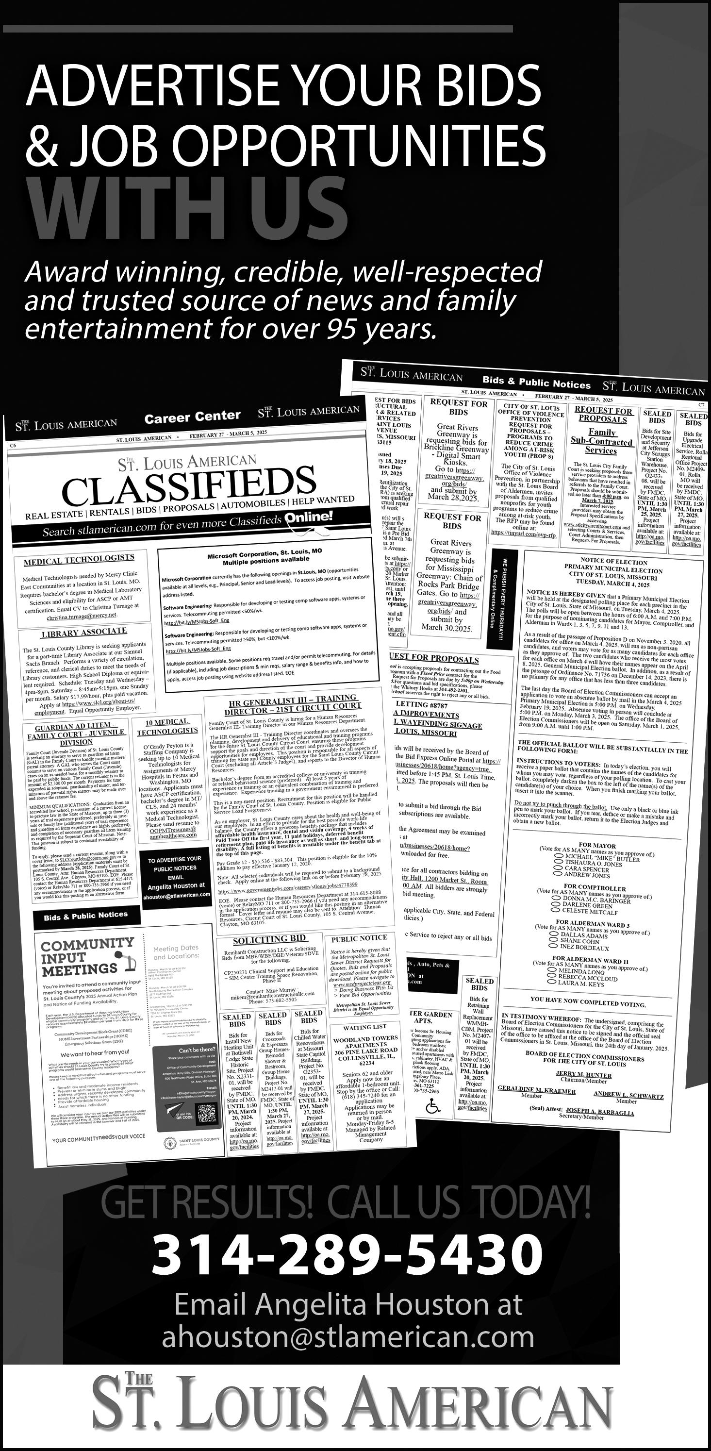 Sealed bids for the Washington Street Resurfacing project, St. Louis County Project No. AR-1719, Federal Project No. STP-5598(609) will be received electronically thru the County’s Vendor Self Service portal at https://stlouiscountymovendors. munisselfservice.com/Vendors/ default.aspx, until 2:00 PM on April 2, 2025