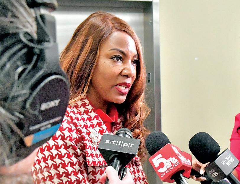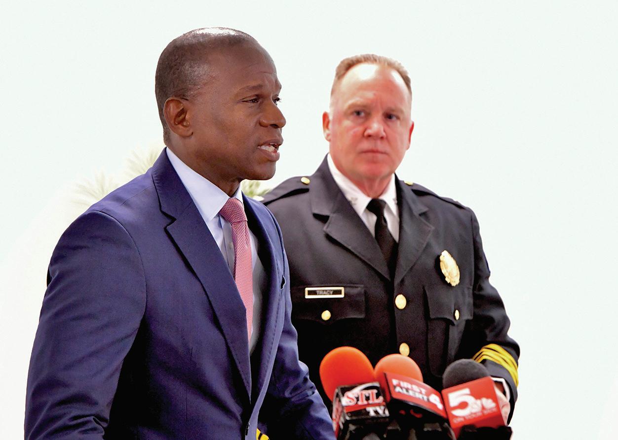 Tracy (rear) and Mayor Tishaura O. Jones at a Jan. 14 press