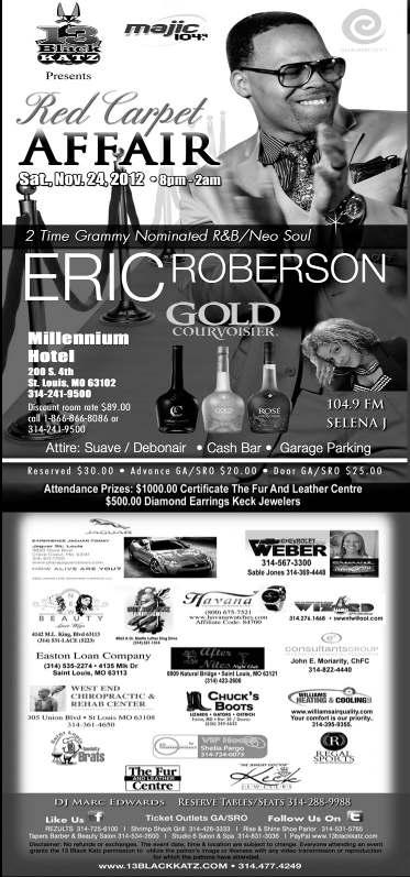 Erro returns…again. Since I’m already talking about good music, I might as well point out that one of the most beloved non-native soul singers to grace a St. Louis stage is coming back thanks to the 13 Black Katz and their Red Carpet Affair next Saturday (Nov. 24) at the Millennium Hotel. The one and only Eric Roberson will be on deck just after Thanksgiving to give us some of his off the cuff love songs…and I.CAN’T.WAIT! I’m also anxious to see how the Katz’ core audience (who is not necessarily in the mix with regards to Erro) will react to his sound. I have rarely seen anyone not feel his vibe and I think the all the way grown and sexy crowd will be a good look for him. The evening kicks off at 8 p.m. and will be hosted by the lovely Selena J