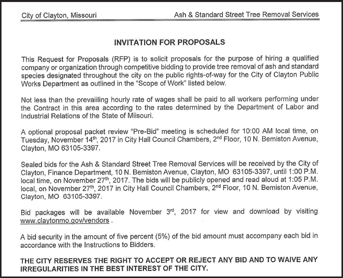 Notice is hereby given that the Metropolitan St. Louis Sewer District is accepting proposals in the Purchasing Division, 2350 Market Street, St. Louis, Missouri 631032555 until 10:00 a.m. on November 30th, 2017 to contract with a company for: Snow Removal Services for the Market Street Location. Specifications and bid forms may be obtained from www.stlmsd.com, click on the “MSD AT WORK” link, (bid opportunities). The bid document will be identified as 9222 RFQ. If you do not have access to the internet, call 314.768.2735 to request a copy of this bid. Metropolitan St. Louis Sewer District is an Equal Opportunity Employer.