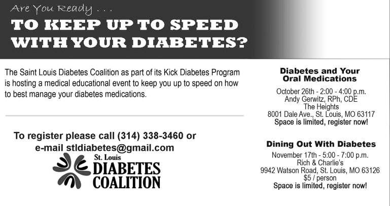 Free, diabetes education program held at various locations by the Diabetes Network of St. Louis. Participants will be offered testing and support for diabetes control. Six sessions will cover monitoring your blood sugar, controlling complications of diabetes, living a healthy life through diet and exercise, and personal goal setting. Call Coco Bopp 314-747-9533 for information.