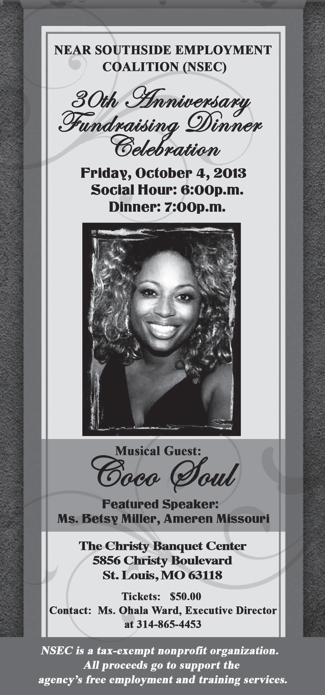 be having our first fundraiser event on Saturday, October 5, at the Old Tymers Bar, 12667 New Halls Ferry, 63033 from 6pm-10pm. For additional information on purchasing a raffle ticket, please contact Scarlett McWell at 314-4587782 or send email to msscarletto@yahoo.com or Sandra Hooker at ayaina612@sbcglobal.net.