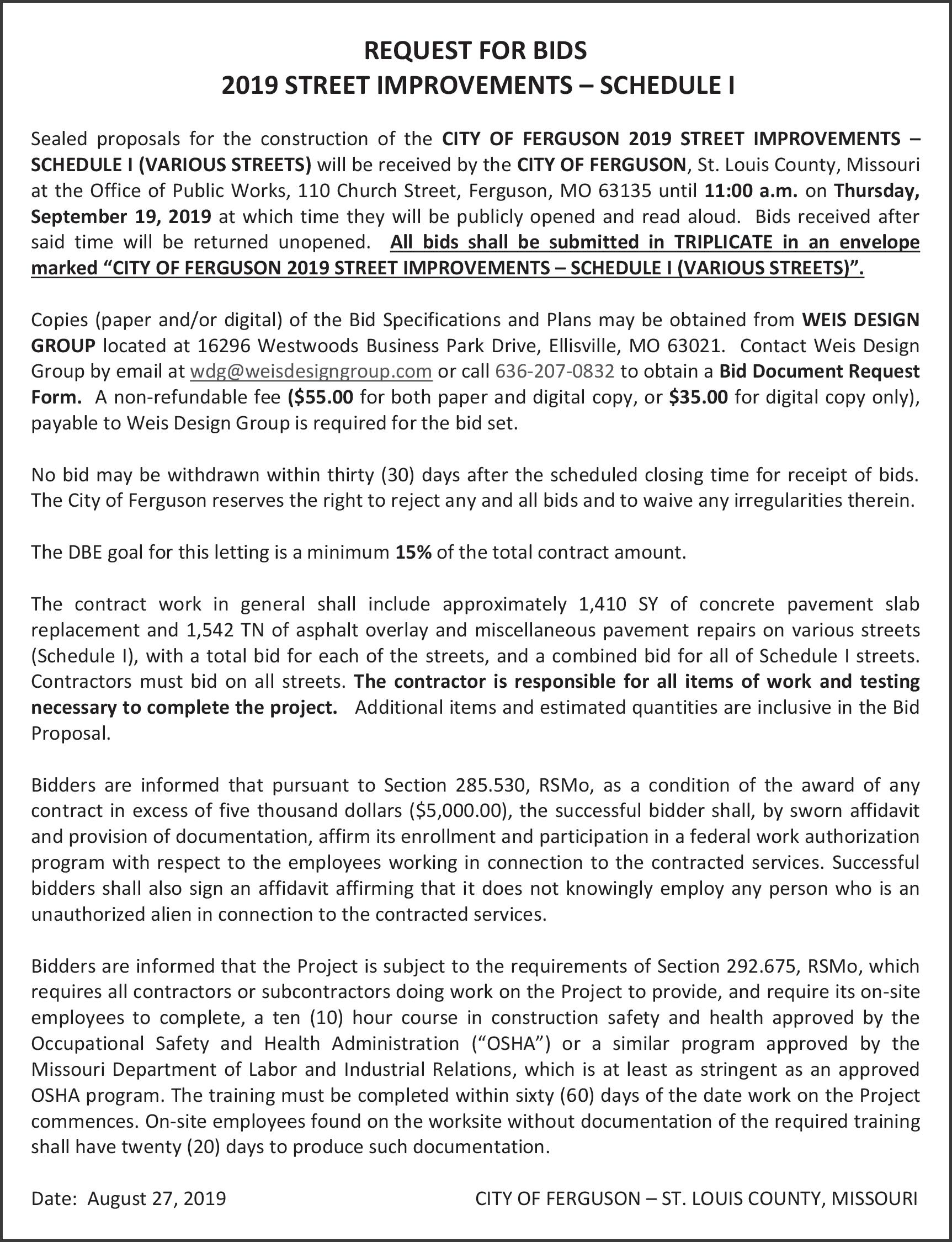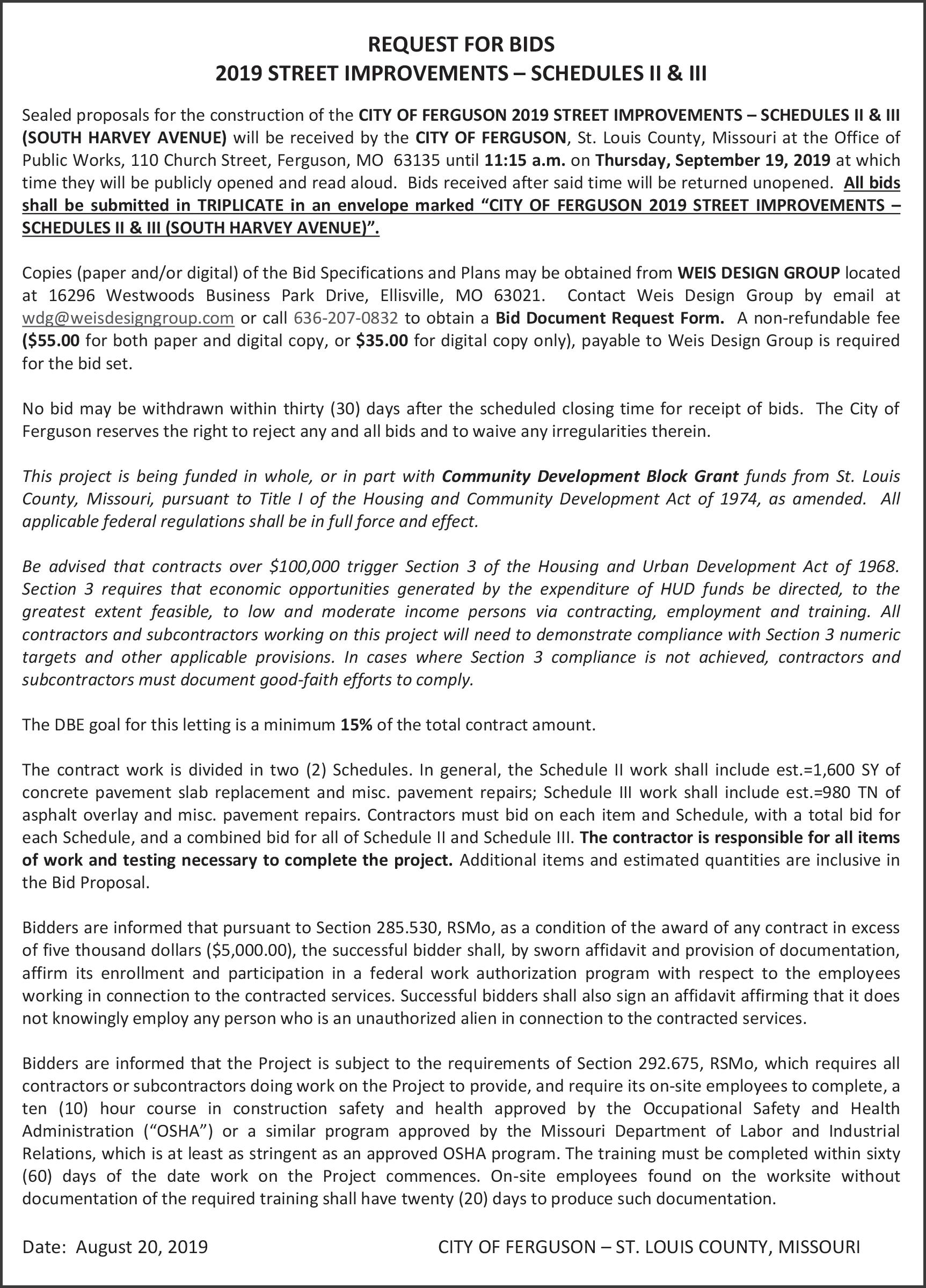 Sealed proposals will be received by the Board of Public Service in Room 208 City Hall, 1200 Market Street, St. Louis, Mo. Until 1:45 PM, CT, on September 24, 2019, then publicly opened and read. Plans and Specifications may be examined on the Board of Public Service website http://www.stl-bps.org/planroom.aspx (BPS On Line Plan Room) and may be purchased directly through the BPS website from INDOX Services at cost plus shipping. No refunds will be made.