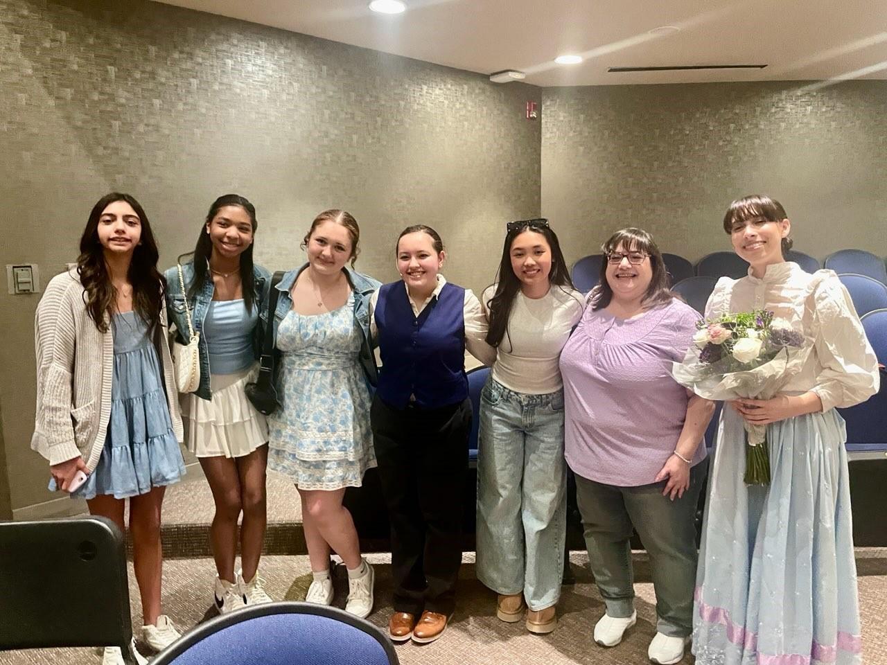 IsabellaJohnson'24,ValeriaAlcala'24,and Lucy Lapus '24 gave outstanding performances in the Duchesne Academy's production of Mary Poppins! Here they are with Ms. Bonno and SLCS 8th graders Gia Montoya, Kyleigh Gregory, and Camila James, who supported our alumni and enjoyedtheshow.