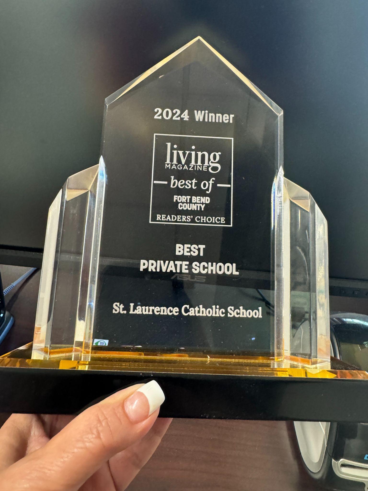 We are thrilled to announce that St. Laurence Catholic School has been awarded Living Magazine's 2024 Readers ChoiceAward for Best Private School in Fort Bend County!
