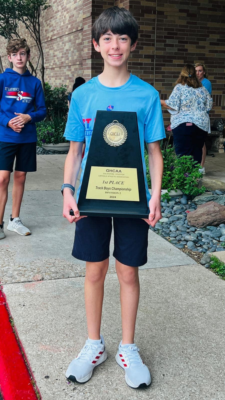 Fr. Truong Son pictured with Coach Mandy Boudreaux and some of the 2024 Track and Field Team Champions: 1st place in GHCAA!