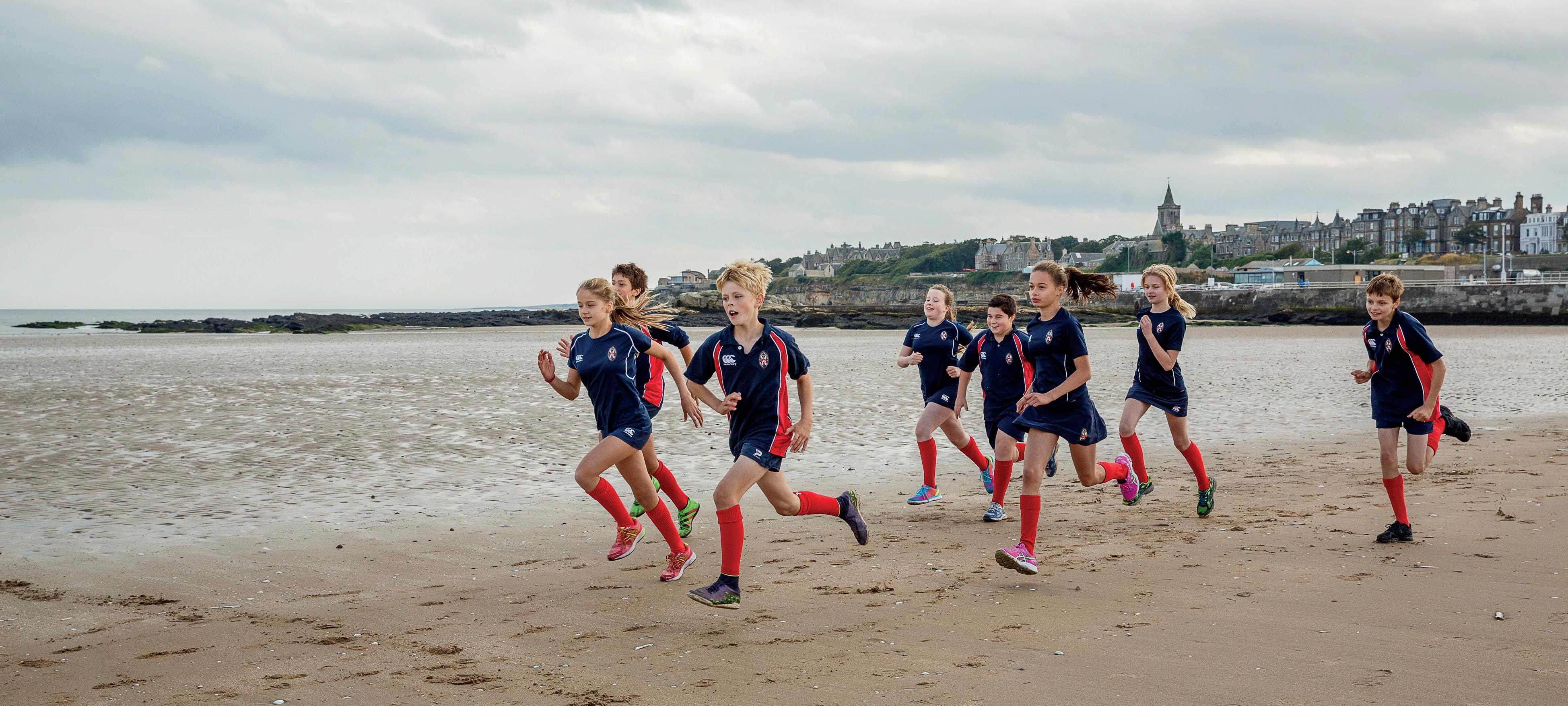 a variety of games and sports in their curricular Games lessons. At lunchtime and after school, there are plenty of different sporting activities for pupils of all ages and abilities including rugby, hockey, tennis, football, gymnastics, swimming, cricket, summer games, and multi-sports. These activities make the most of our extensive sports facilities which include a 25-metre indoor swimming pool, squash and tennis courts, an AstroTurf, grass pitches, and an indoor sports hall. Our avid runners enjoy exploring the local area and venturing along the beaches and the Fife Coastal Path in our after-school Running Club.