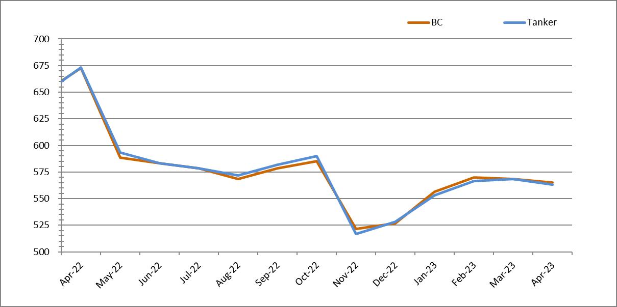 2021 Average 2022 Average 2023 Average 2022 April 2023 April USD/LDT YoY USD/LDT YoY USD/LDT YoY USD/LDT USD/LDT MoM YoY TANKER 526.81 52.9% 590.28 12.0% 562.92 -4.6% 673.33 563.33 -0.9% -16.3% BC 529.17 53.6% 588.56 70.8% 565.00 -4.0% 672.67 565.00 -0.6% -16.0% ❖기준 : 인도 해체선