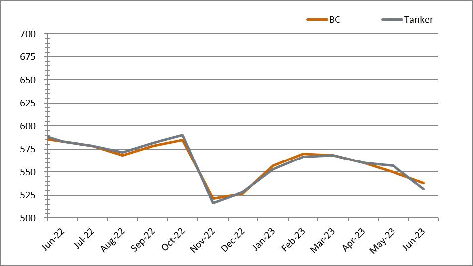 2023-06-02 2023-05-26 CHANGE 1 Year High 1 Year Low BDI 919 1,172 ▼253.00 3,369 530 BCI 1,116 1,683 ▼567.00 4,602 271 BPI 1,030 1,119 ▼89.00 3,382 809 BSI 819 946 ▼127.00 2,833 625 BHSI 545 588 ▼43.00 1,673 431