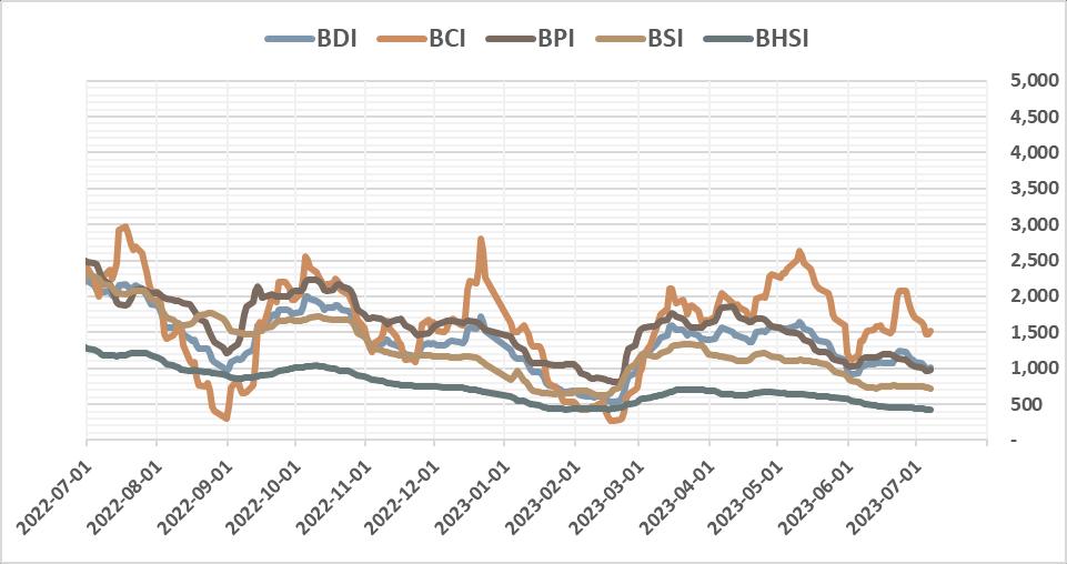 2023-07-07 2023-06-30 CHANGE 1 Year High 1 Year Low BDI 1,009 1,091 ▼82.00 2,214 530 BCI 1,522 1,704 ▼182.00 2,967 271 BPI 984 1,030 ▼46.00 2,477 809 BSI 724 749 ▼25.00 2,290 625 BHSI 424 446 ▼22.00 1,276 424