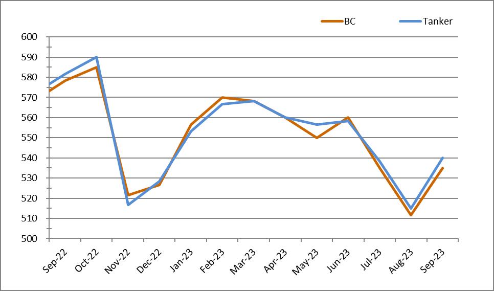 2021 Average 2022 Average 2023 Average 2022.09 2023.09 USD/LDT YoY USD/LDT YoY USD/LDT YoY USD/LDT USD/LDT MoM YoY TANKER 526.81 52.9% 590.28 12.0% 550.74 -6.7% 581.67 540.00 4.9% -7.2% BC 529.17 53.6% 588.56 70.8% 549.63 -6.6% 578.33 535.00 4.6% -7.5% ❖기준 : 인도 해체선 시장