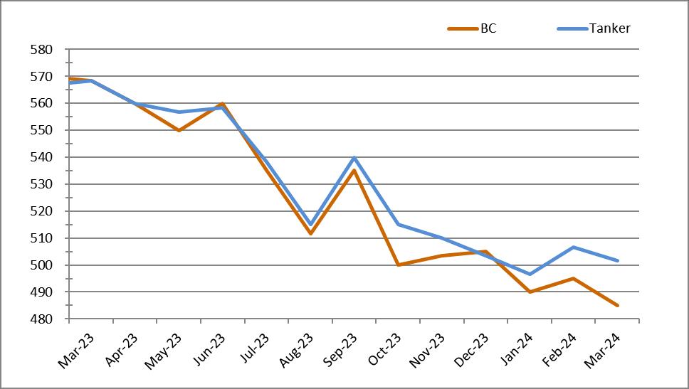 2022 Average 2023 Average 2024 Average 2023.03 2024.03 USD/LDT YoY USD/LDT YoY USD/LDT YoY USD/LDT USD/LDT MoM YoY TANKER 590.28 12.0% 540.42 -8.4% 501.67 -7.2% 568.33 501.67 -1.0% -11.7% BC 588.56 70.8% 537.92 -8.6% 490.00 -8.9% 568.33 485.00 -2.0% -14.7% ❖기준