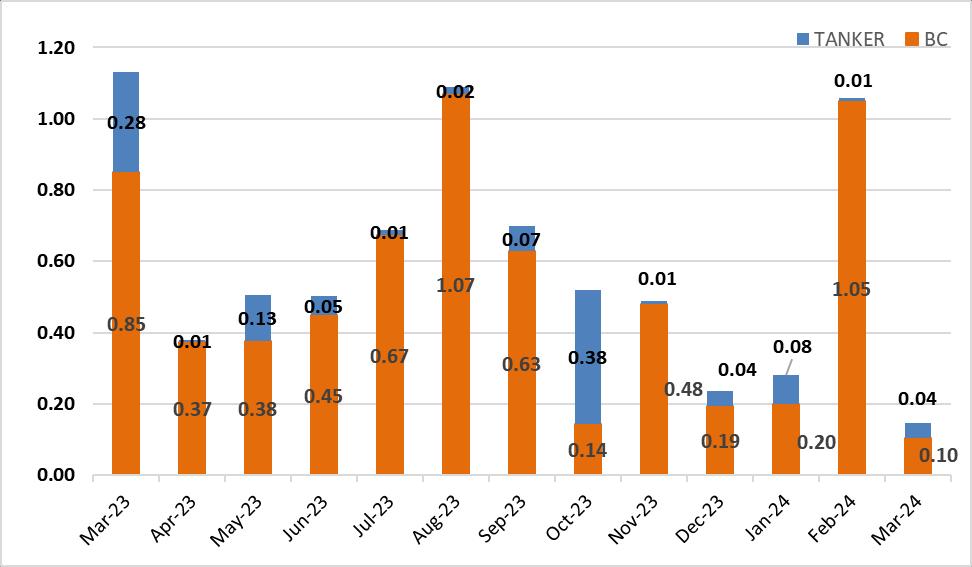 해체선 총량 2022 2023 2023.03 2024.03 Million DWT No. of Vessel Million DWT No. of Vessel Million DWT No. of Vessel Million DWT YoY No. of Vessel YoY TANKER 6.50 134 1.26 51 0.28 7 0.04 -84.8% 3 -57.1% *BC 4.48 63 6.03 151 0.85 11 0.10 -87.8% 5 -54.5% *BC incl. General cargo vessel