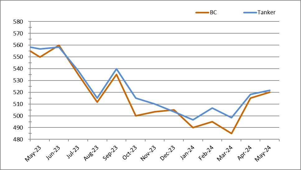 2022 Average 2023 Average 2024 Average 2023.05 2024.05 USD/LDT YoY USD/LDT YoY USD/LDT YoY USD/LDT USD/LDT MoM YoY TANKER 590.28 12.0% 540.42 -8.4% 508.33 -5.9% 556.67 521.67 0.6% -6.3% BC 588.56 70.8% 537.92 -8.6% 501.00 -6.9% 550.00 520.00 1.0% -5.5% ❖기준 : 인도 해체선 시장