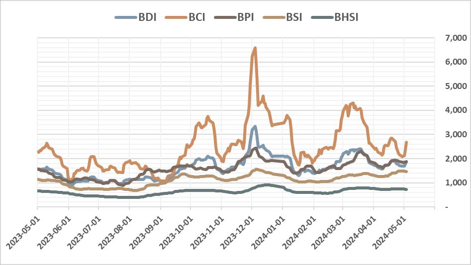 2024-05-03 2024-04-26 CHANGE 1 Year High 1 Year Low BDI 1,876 1,721 ▲155.00 3,346 919 BCI 2,673 2,172 ▲501.00 6,582 997 BPI 1,884 1,878 ▲6.00 2,441 895 BSI 1,458 1,495 ▼37.00 1,565 686 BHSI 729 751 ▼22.00 908 389