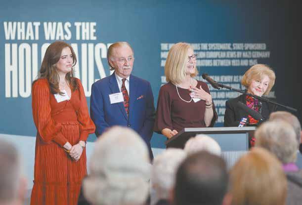 Above, Carol Staenberg, the newly-appointed Board Chair of the St. Louis Kaplan Feldman Holocaust Museum, speaks at the museum’s reopening event Nov. 2. At right, Cheryle Feldman Atkin speaks, flanked by Sara Atkin, David Kaplan and Gloria Kaplan Feldman.