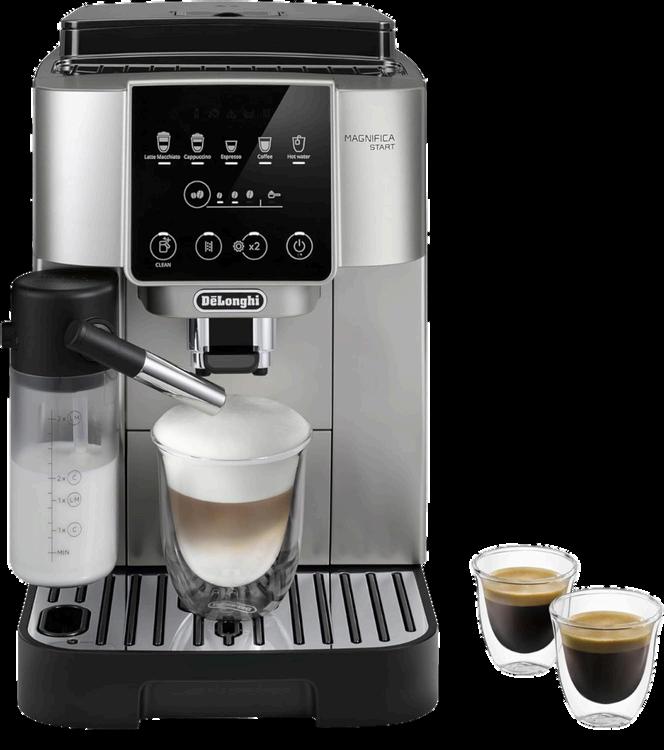 This fully automatic espresso machine features a simple, easy to navigate design, making it the perfect machine for both beginners and aficionados alike. Featuring 5 pre-set recipes including espresso, latte macchiato, and cappuccino, the onetouch display panel makes it easier than ever to enjoy espresso made right, right at home. The built-in conical burr grinder and brewing unit deliver the freshest espresso with a perfect grind, dose, and brew every time, leaving you with a rich and aromatic drink. De’Longhi’s proprietary LatteCrema™ Hot System is expertly designed to automatically craft espresso beverages with a long-lasting, silkysmooth foam—with milk or your favorite milk alternatives, like oat, almond, and soy milk. Clean-up is simple with the auto-clean function and detachable, dishwasher-safe parts. With the Magnifica Start, enjoying your favorite authentic espresso beverages from the comfort of your home is simple.