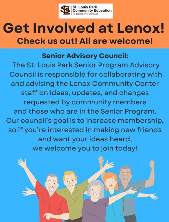 The St. Louis Park Senior Program, based at Lenox Community Center, is for adults ages 50 and better. It is operated through a partnership between the City of St. Louis Park and St. Louis Park Community Education (a department of St. Louis Park Public Schools). Pick up your Newscaster publication at Lenox Community Center, with more classes to choose from!