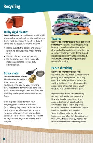 Deliver to events/drop-offs or collected separately: Textiles, including clothing, blankets, towels can be collected or dropped-off by certain organizations for reuse or recycling. These items should never be placed in your recycling cart. Visit www.stlouispark.org/reuse for more information.