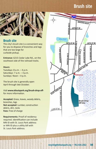 The city’s brush site is a convenient way for you to dispose of branches and logs that are too large for curbside pickup. Entrance: 6215 Cedar Lake Rd., on the southeast side of the railroad tracks. Hours: Tuesdays: 8 a.m. – 4 p.m. Saturdays: 7 a.m. – 3 p.m. Sundays: Noon – 4 p.m. The brush site is generally open April through late October. Visit www.stlouispark.org/brush-drop-offfor more information. Accepted: Grass, leaves, woody debris, branches, logs Not accepted: Lumber, construction debris, dirt, rocks Fees: Free of charge Requirements: Proof of residency required. Identification can include MN ID with St. Louis Park address or MN ID plus a utility bill with St. Louis Park address.