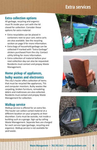 All garbage, recycling and organics must fit inside your cart with the lid closed for collection. Consider these options for extra material: • E xtra recyclables can be placed in containers next to your cart; extra carts are also available. See the recycling section on page 9 for more information. • Extra bags of household garbage can be collected if marked with “Extra Garbage” stickers purchased from the city. Contact utility billing for more information. • Extra collection of material before your next collection day can also be requested. Residents must contact and prepay Waste Management.