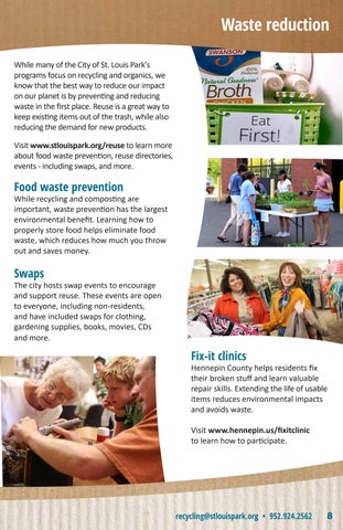 Waste reduction While many of the City of St. Louis Park's programs focus on recycling and organics, we know that the best way to reduce our impact on our planet is by preventing and reducing waste in the first place. Reuse is a great way to keep existing items out of the trash, while also reducing the demand for new products. Visit www.stlouispark.org/reuse to learn more about food waste prevention, reuse directories, events - including swaps, and more.