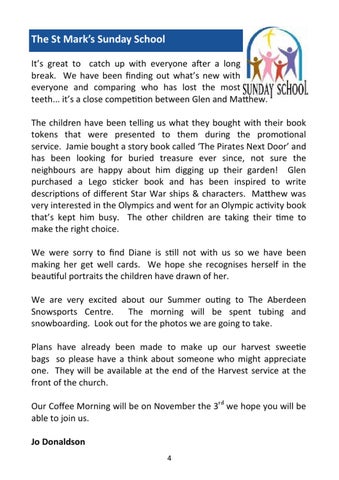 The St Mark’s Sunday School It’s great to catch up with everyone aKer a long break. We have been finding out what’s new with everyone and comparing who has lost the most teeth... it’s a close compe on between Glen and Ma&hew. The children have been telling us what they bought with their book tokens that were presented to them during the promo onal service. Jamie bought a story book called ‘The Pirates Next Door’ and has been looking for buried treasure ever since, not sure the neighbours are happy about him digging up their garden! Glen purchased a Lego s cker book and has been inspired to write descrip ons of different Star War ships & characters. Ma&hew was very interested in the Olympics and went for an Olympic ac vity book that’s kept him busy. The other children are taking their me to make the right choice. We were sorry to find Diane is s ll not with us so we have been making her get well cards. We hope she recognises herself in the beau ful portraits the children have drawn of her. We are very excited about our Summer ou ng to The Aberdeen Snowsports Centre. The morning will be spent tubing and snowboarding. Look out for the photos we are going to take. Plans have already been made to make up our harvest swee e bags so please have a think about someone who might appreciate one. They will be available at the end of the Harvest service at the front of the church. Our Coffee Morning will be on November the 3rd we hope you will be able to join us. Jo Donaldson 4