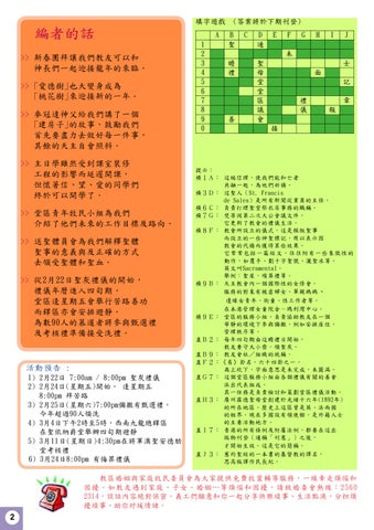 編者的話 >> 新春團拜讓我們教友可以和 神長們一起迎接龍年的來臨. >> 「愛德樹」也大變身成為 「桃花樹」來迎接新的一年. >> 麥冠達神父給我們講了一個 「建房子」的故事,鼓勵我們 首先要盡力去做好每一件事, 其餘的天主自會照料. >> 主日學雖然受到課室裝修 工程的影響而延遲開課, 但懷著信、望、愛的同學們 終於可以開學了. >> 堂區青年牧民小組為我們 介紹了他們未來的工作目標及路向. >> 送聖體員會為我們解釋聖體 聖事的意義與及正確的方式 去領受聖體和聖血. >> 從2月22日聖灰禮儀的開始, 禮儀年曆進入四旬期. 堂區逢星期五會舉行苦路善功 而鐸區亦會安排避靜. 為數90人的慕道者將參與甄選禮 及考核禮準備接受洗禮.