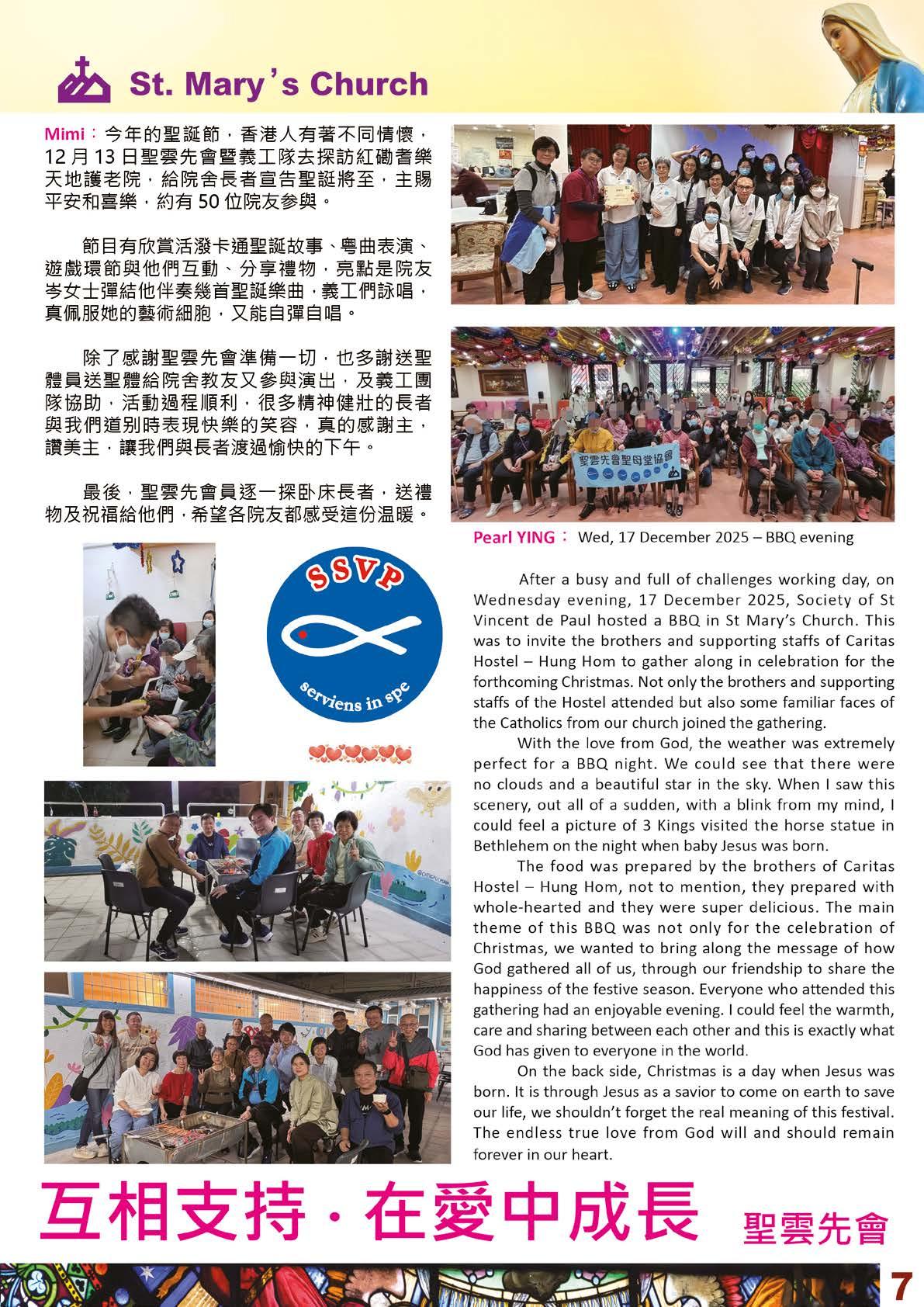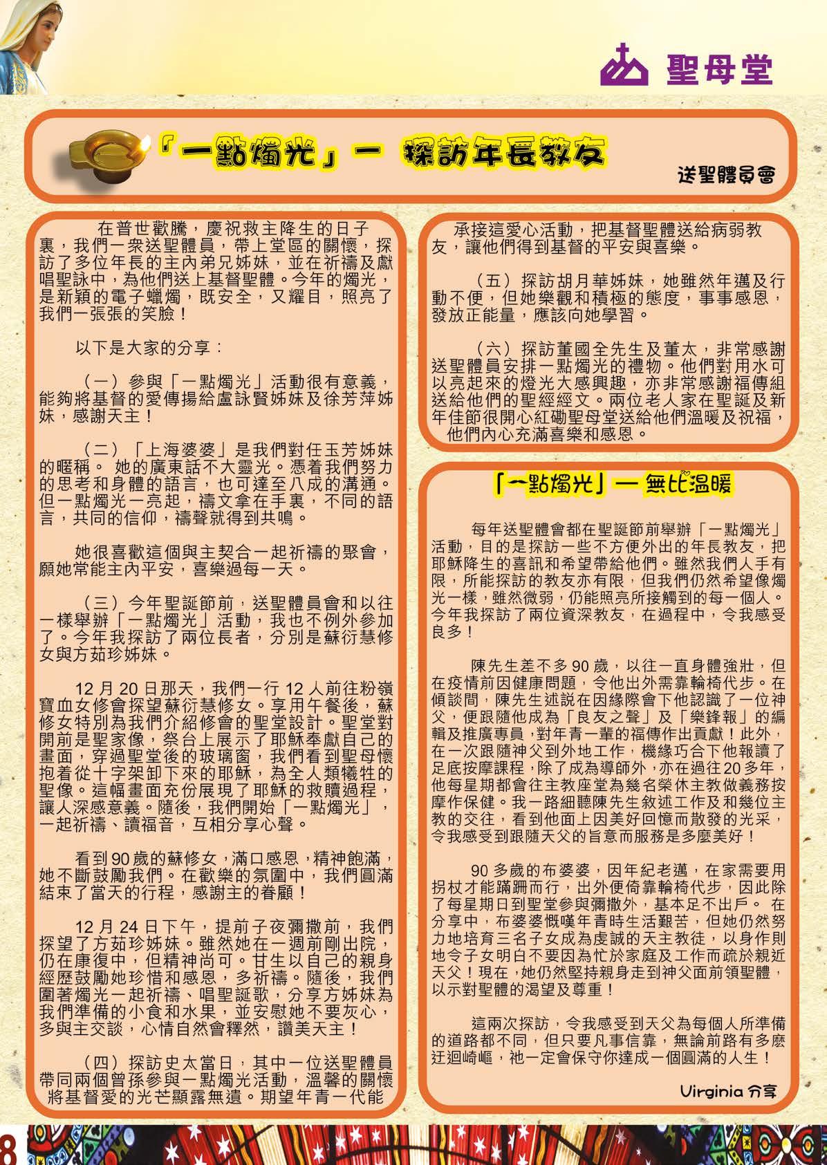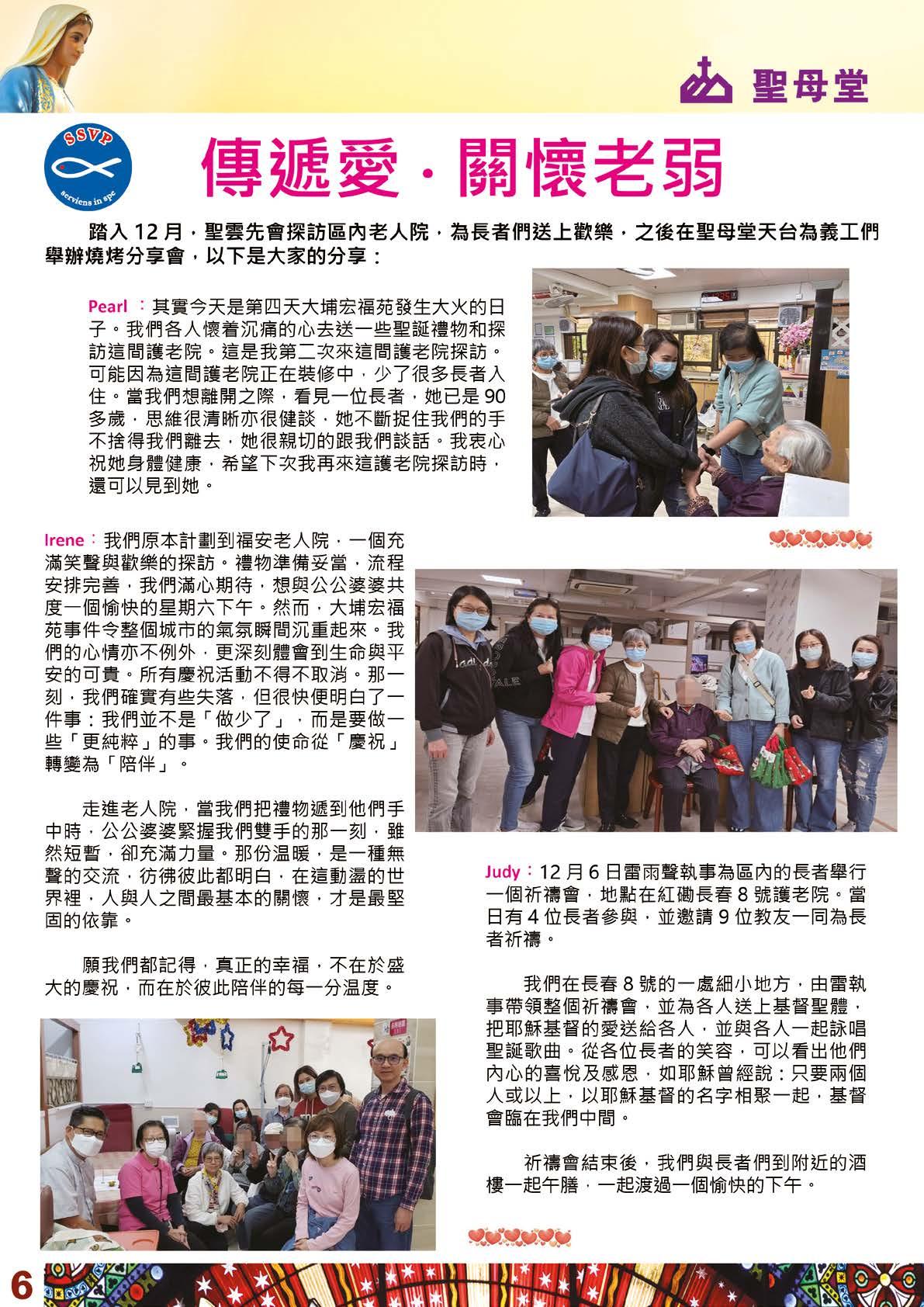 福傳及培育組在12月30日到土瓜灣明愛 九龍社區中心服務站,與該處的社工黃姑娘、 黎姑娘與當區的街訪們一起共度一個名叫「除 夕手牽手」活動。福傳組三位組員和麥修女一 起,帶著小小禮物和介紹天主教信仰與聖母堂 簡介的單張送給他們聊表心意。