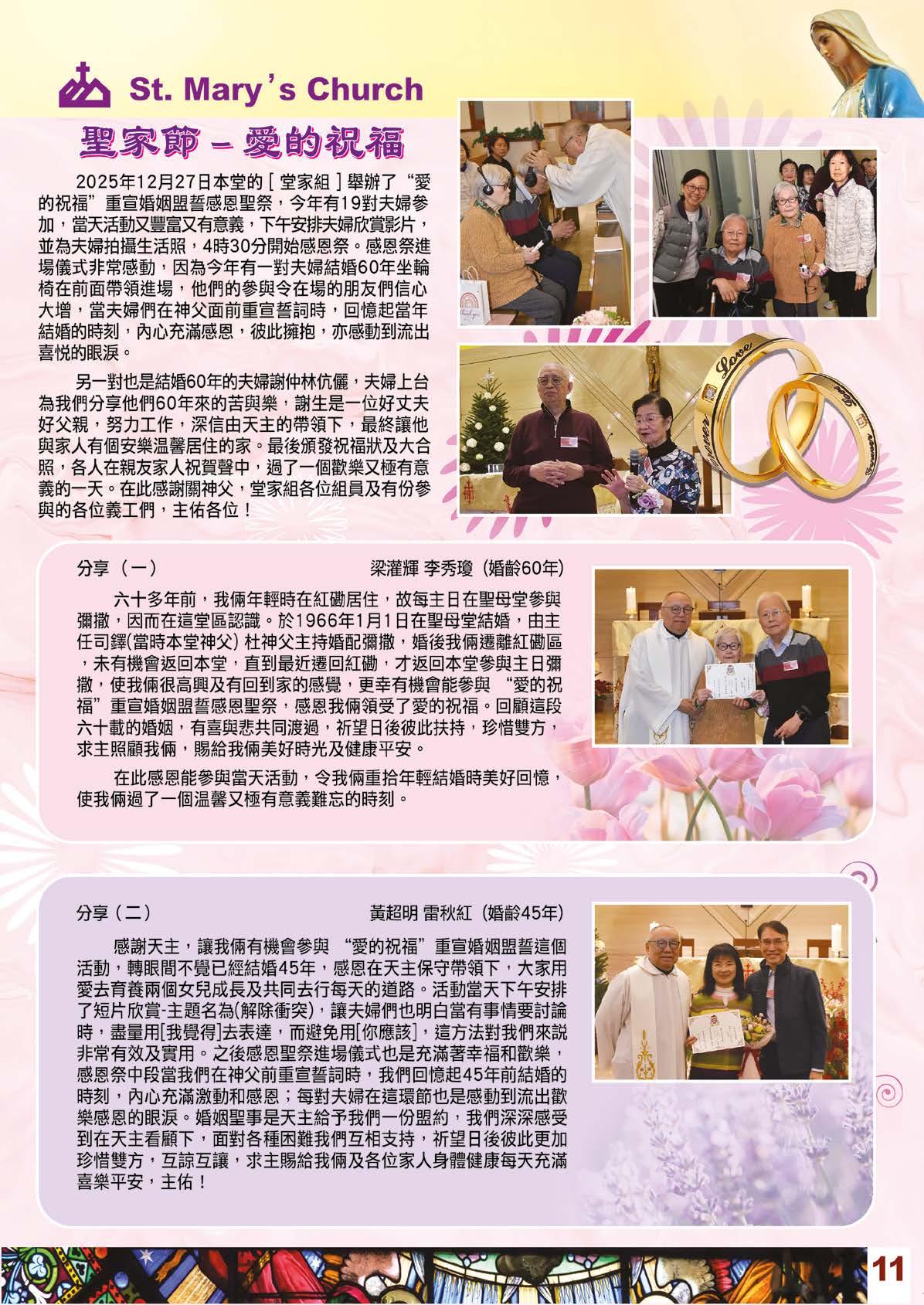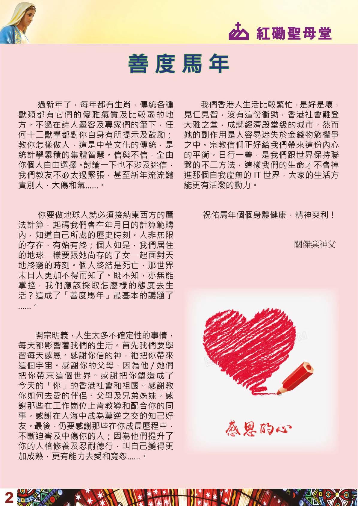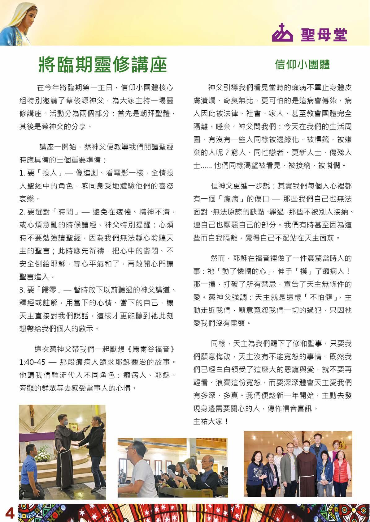 福傳及培育組在12月30日到土瓜灣明愛 九龍社區中心服務站,與該處的社工黃姑娘、 黎姑娘與當區的街訪們一起共度一個名叫「除 夕手牽手」活動。福傳組三位組員和麥修女一 起,帶著小小禮物和介紹天主教信仰與聖母堂 簡介的單張送給他們聊表心意。