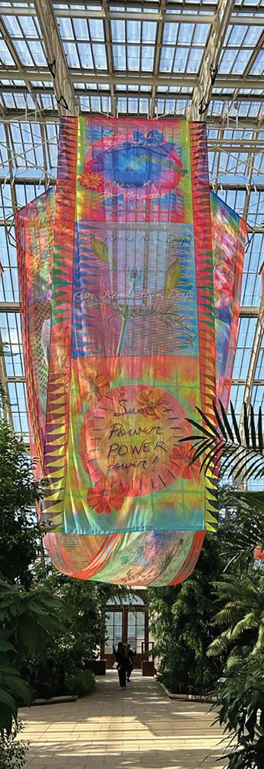 In addition to photography, the students recorded their ideas by sketching the structure of the Temperate House and surrounding buildings. Within the Temperate House and displayed in situ with the natural forms was the mixed media hanging artwork by artist Jefrey Gibson entitled ‘House of Spirits’. The spectacular hanging artwork was an intricate, layered collage of fabric, illustrations, text, colour, and pattern. The bright light reflecting through the glass ceilings of the Temperate House highlighted the writing and patterns on the fabric which created a visually stunning, harmonious efect with the surrounding foliage.