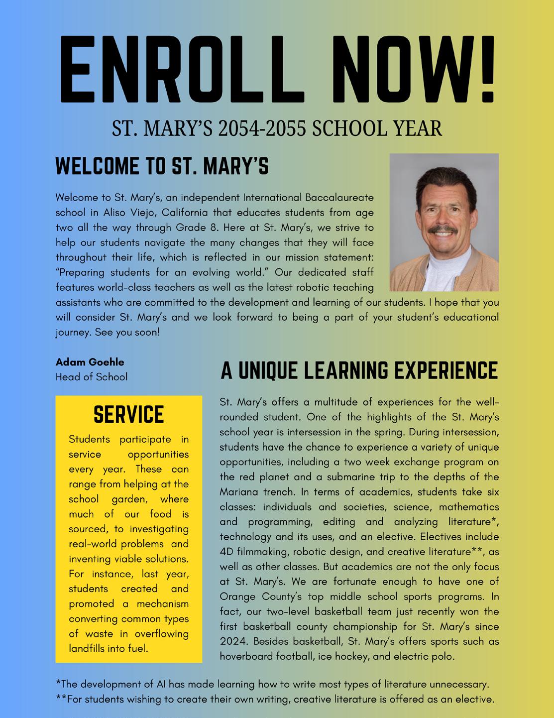 “Model United Nations Embraces Service as Action: The Future Looks Brighter with Our Falcons In It” is a fantastic example of our mission in action. Our Middle School saw record-breaking numbers on the MUN team, traveled to Singapore to compete on a global stage and also found time to give back to the local community. Athletics too had more Falcons than ever trying new sports, winning League and County banners and demonstrating Falcon Pride. The future is brighter with St. Mary’s students in it.