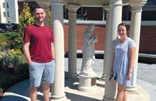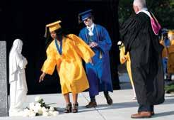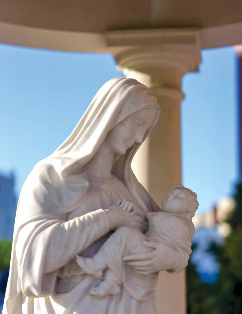The cover shows Holy Mary holding baby Jesus. This statue formerly lived in St. Mary’s Chapel and now stands where the altar once stood under a Grotto dedicated by Terence McGinnis ’63 in memory of his parents and grandparents. The Holy Mary statue, in the front left corner here and on the back cover, is the statue which previously stood in the rear of campus near the bridge and now looks toward the Cardinal Seán Fountain and the Connell building.
