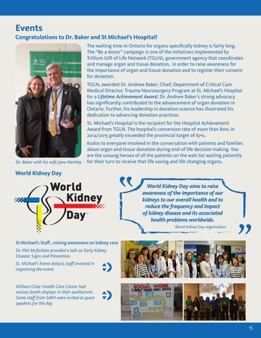 Events Congratulations to Dr. Baker and St Michael’s Hospital! The waiting time in Ontario for organs specifically kidney is fairly long. The “Be a donor” campaign is one of the initiatives implemented by Trillium Gift of Life Network (TGLN), government agency that coordinates and manage organ and tissue donation, in order to raise awareness for the importance of organ and tissue donation and to register their consent for donation. TGLN, awarded Dr. Andrew Baker, Chief, Department of Critical Care Medical Director, Trauma Neurosurgery Program at St. Michael’s Hospital for a Lifetime Achievement Award. Dr. Andrew Baker’s strong advocacy has significantly contributed to the advancement of organ donation in Ontario. Further, his leadership in donation science has illustrated his dedication to advancing donation practices. St. Michael’s Hospital is the recipient for the Hospital Achievement Award from TGLN. The hospital’s conversion rate of more than 80% in 2014/2015 greatly exceeded the provincial target of 67%.
