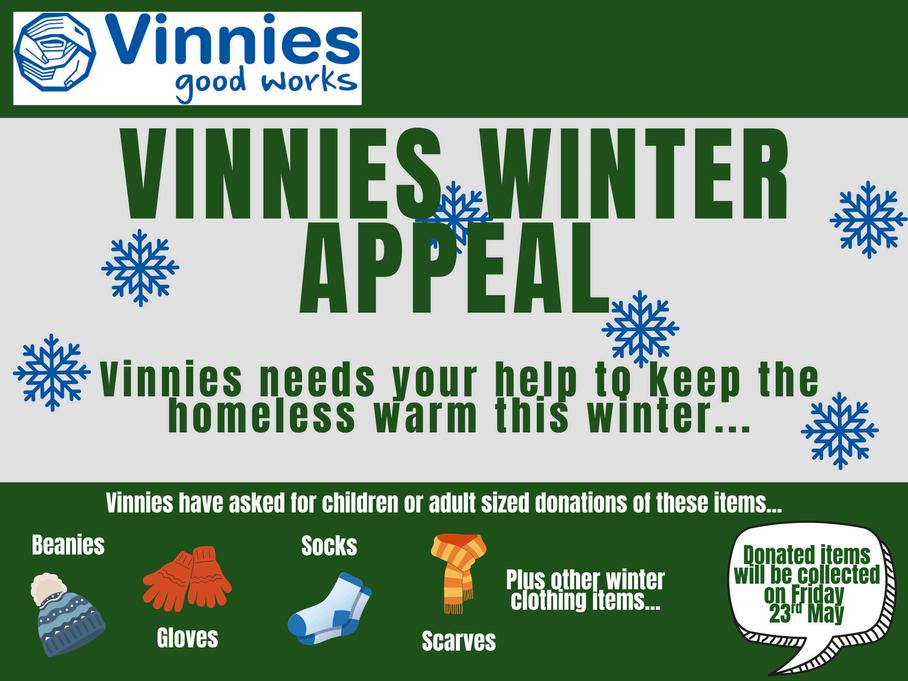 As we journey through the Jubilee Year 2025 as Pilgrims of Hope, we are called to walk in compassion and solidarity with those in need. In the spirit of hope and mercy, St Michael’s is supporting the Vinnies Winter Appeal to help families doing it tough this winter. We invite all families to donate warm clothing which will be collected on Friday 23 May Your generosity will bring warmth and hope to others in our community thank you for being a sign of hope this Jubilee Year.