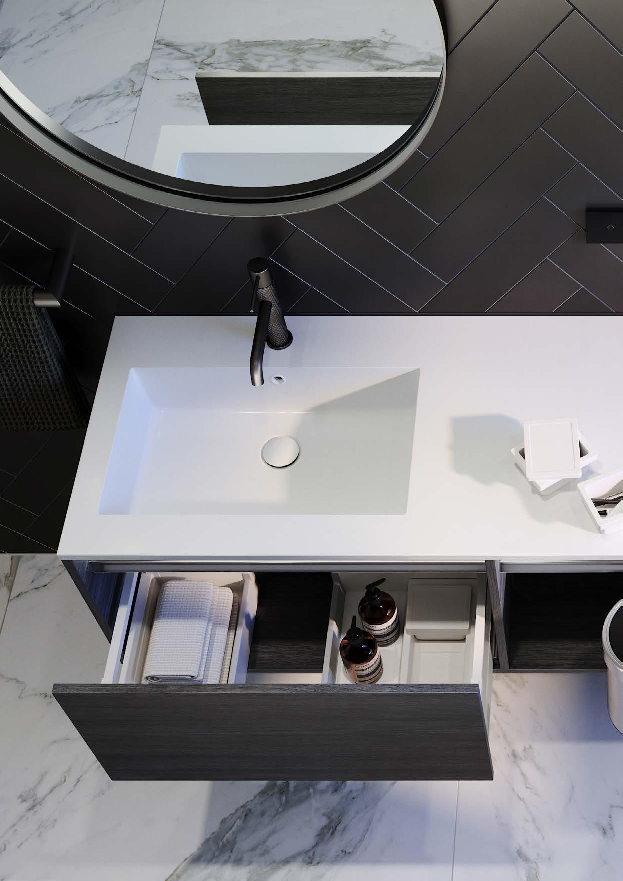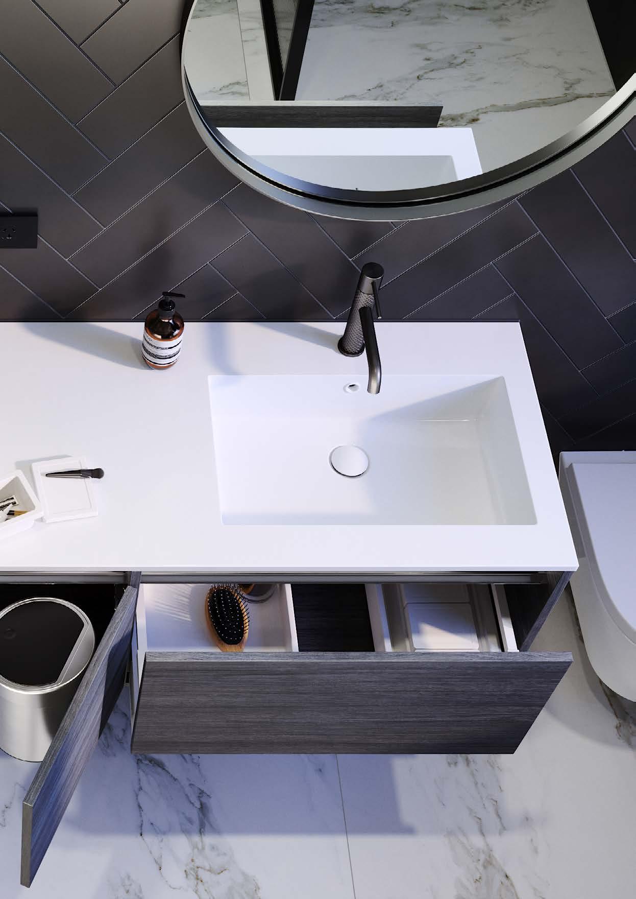 NOTE: Front panels clip on/off (drawers and doors), to allow for easy future updates. Enquire instore. Onda Storage Kit Type C or D: Included with every City 35 vanity. Refer to page 13 for more details.