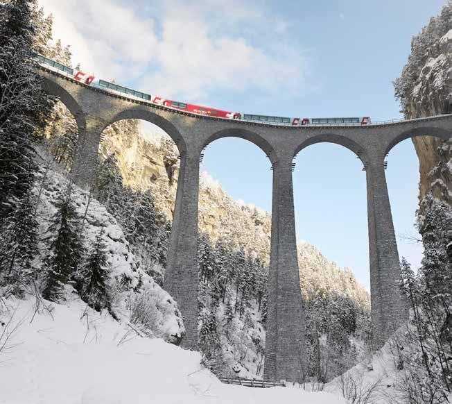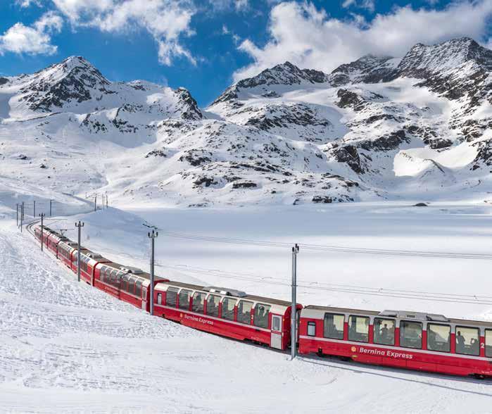 Este tren rojo brillante atraviesa Europa de norte a sur desde hace más de 50 años ofrece una de las travesías alpinas más espectaculares de Suiza. A lo largo de magníficos valles, el convoy atravesará hasta 55 túneles y pasará sobre 196 puentes en un recorrido escénico único. Dejar atrás el paso Bernina hasta Engadina regala postales como la curva de Montebello, el impresionante viaducto circular de Brusio o el glaciar Morteratsch, entre otras. Desde Coria hasta Tirano, la línea Albula/Bernina del Ferrocarril Rético, declarada Patrimonio de la Humanidad por la UNESCO, lleva hasta Chur, la ciudad más antigua de Suiza.
